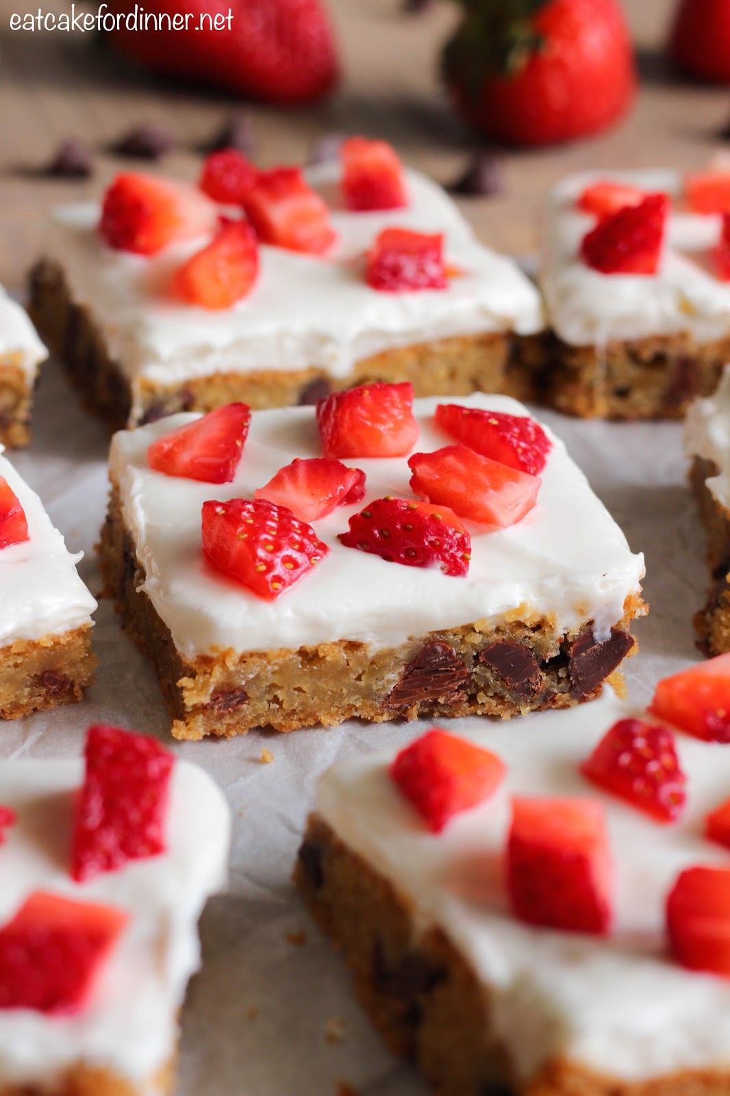 They are a soft and chewy, homemade, chocolate chip cookie bar covered with a smooth and creamy cheesecake mixture and topped with fresh strawberries.